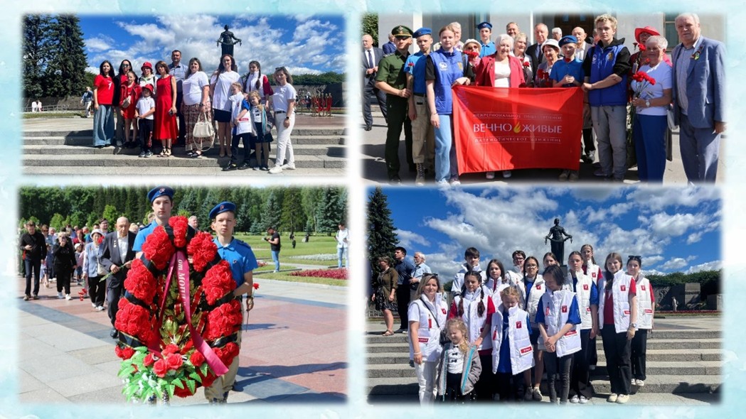 В колонне делегации Межрегионального Общественного Патриотического Движения «ВЕЧНО ЖИВЫЕ» шли юнармейцы СОШ № 156, Волонтеры Победы, участник Великой Отечественной войны Валентин Иванович Богданов, ветераны-блокадники. Минутой молчания почтили память погибших, возложили венок и цветы к монументу «Родина-мать».